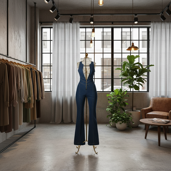This jumpsuit is designed for a body-sculpting, "snatched" fit. It features a cinched waistline and a flared leg to elongate your silhouette. The denim has a slight stretch to hug your curves while maintaining its structure.